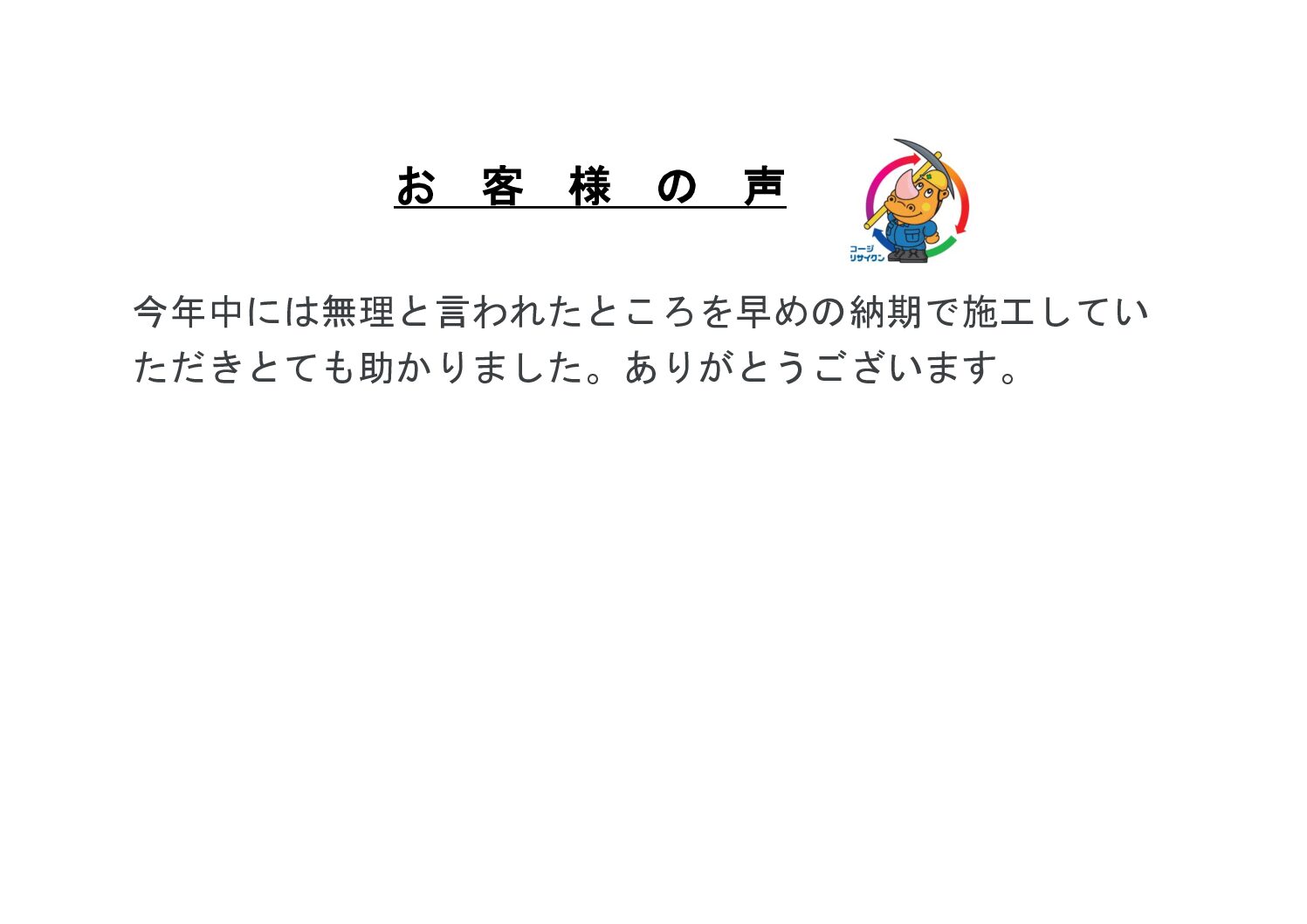 2025年12月29日 仙台市 カーポート撤去工事 K様 詳しくはこちら 2025年10月20日 仙台市 コンクリートブロック撤去処分工事 H様 詳しくはこちら 2025年09月11日 仙台市 木造2階建住宅解体工事 A様 詳しくはこちら 2025年09月09日 仙台市 物置解体 M様 詳しくはこちら 2025年09月01日 仙台市 RC解体工事 I様 工場 詳しくはこちら 2025年09月01日 仙台市 原状回復工事 M様 詳しくはこちら 2025年09月01日 仙台市 木造2階建住宅解体工事 A様 詳しくはこちら 2025年09月01日 仙台市 CBブロック撤去工事 W様 詳しくはこちら 投稿のページ送り 1 2 >